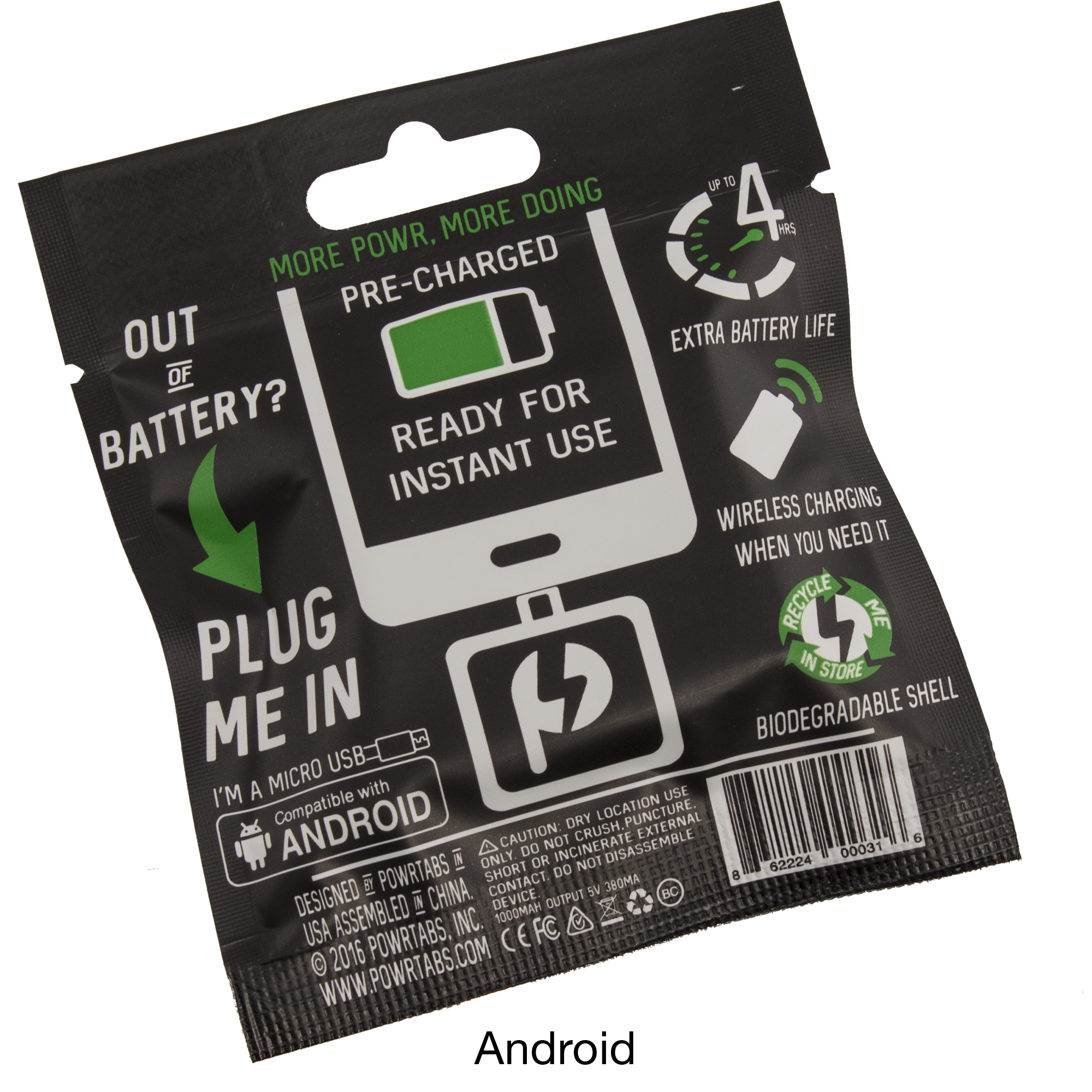 Powerbanks solve for everyday boneheadedness like forgetting to charge your phone overnight. These Powrtabs solve for unforeseen problems, like when you leave Dave and Buster’s and your phone battery drops from 40% to 1% for some reason and you can’t check to see where your Uber driver is and you’re too embarrassed to go back into Dave and Buster’s and ask if they have a phone charger because it’s already sort of embarrassing to be an adult who plays video games, never mind one who can’t take care of basic needs like keeping their phone charged.
