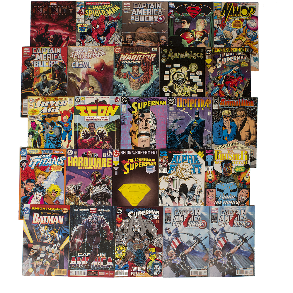 - Model: ? - Condition: New - Material: Paper, ink, maybe staples I guess? What’s in the Box? ==== 25x Comic books 10x Collector card packs Pictures ==== Pile of comics Stack Cards “Are you gonna stand there reading it all day or buy it, kid?” Example Sample Another One more Slacker