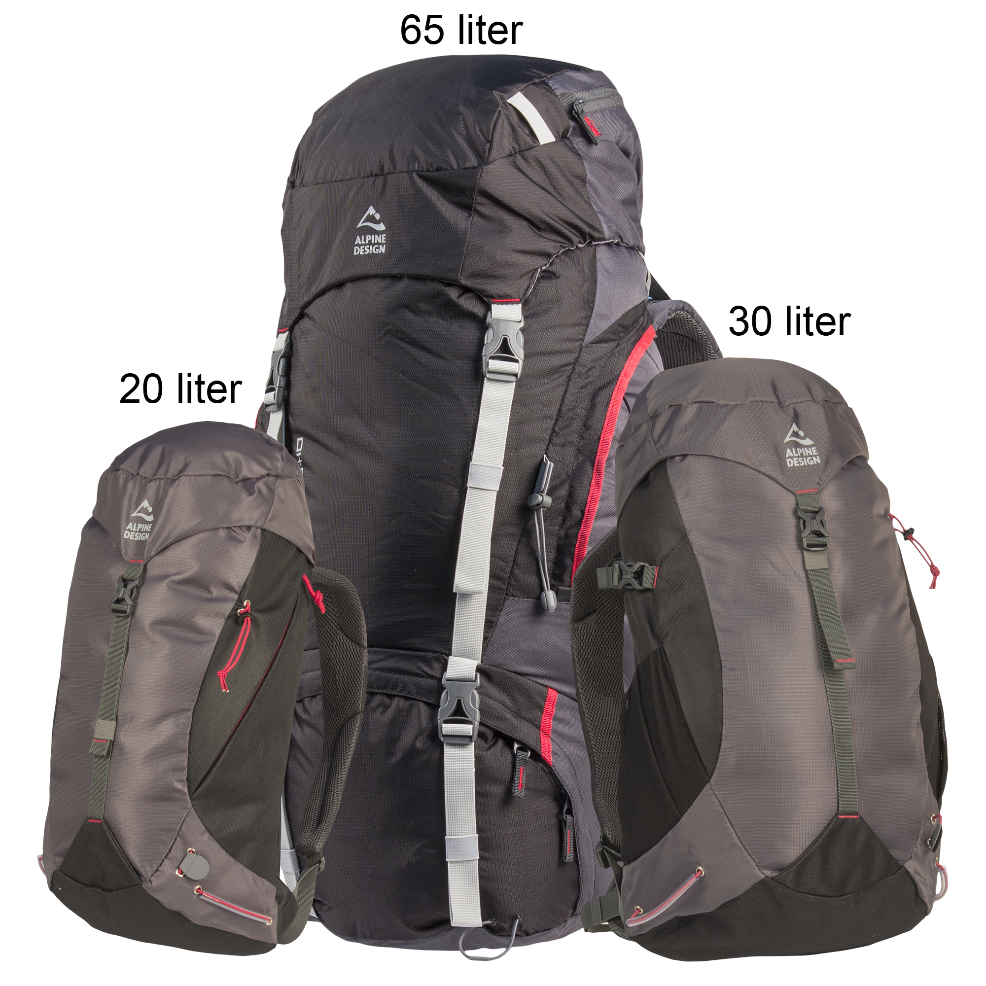 ||Midwood|Midwood Air|Maple||—|—|—|—||Model:|252162|252141|252163||Condition:|New|New|New||Capacity:|20L|30L|65L main + 10L top||Material:|Nylon|Nylon|Nylon||Back:|Ergonomic back with breathable mesh|Framed back with ventilated mesh panel|Framed back with thick lower padding||Main:|Easy access with drawstring closure|Easy access with drawstring closure|Easy access with drawstring closure, dual-vertical front zipper, or bottom horizontal zipper||Side:|2 x Zippered|2 x Elastic|2 x Zippered||Top:|Fold over canopy with adjustable clip closure and exterior zippered pocket|Fold over canopy with adjustable clip closure and exterior zippered pocket|Fold over canopy with adjustable dual clip closure and dual zippered compartments adding up to 10L of storage, plus 2 elastic exterior loops||Straps:|Padded with 2 keeper loops|Padded with 2 keeper loops and adjustable sternum strap and hip belt|Fully adjustable FLEX system with 2 keeper loops, 2 vertical straps, adjustable sternum strap with whistle, and padded hip belt with pocket||Extras:|Ice tool or trekking pole loop with bungee tie-off|Ice tool or trekking pole loop with bungee tie-off|Ice tool or trekking pole loop with bungee tie-off||Extras:|2 x Gear Loops|2 x Gear Loops and adjustable side clip loops|2 x adjustable vertical pack straps||Extras:|||Elastic inner pouch (could be used for hydration pack)||Extras:|||Pouch with integrated raincover ||Weight:|1.2 lbs|1.7 lbs|4.4 lbs| What’s in the Box?====1x BackpackPictures==== OptionsThe big onethe other sideBackDetailFor the rainLittle oneOther sideBackMedium oneOther sideBackHeehawPrice Comparison====20-Liter was $39.99 at Sports Authority30-Liter was $59.99 at Sports Authority65+10 Liter was $99.99 at Sports Authority