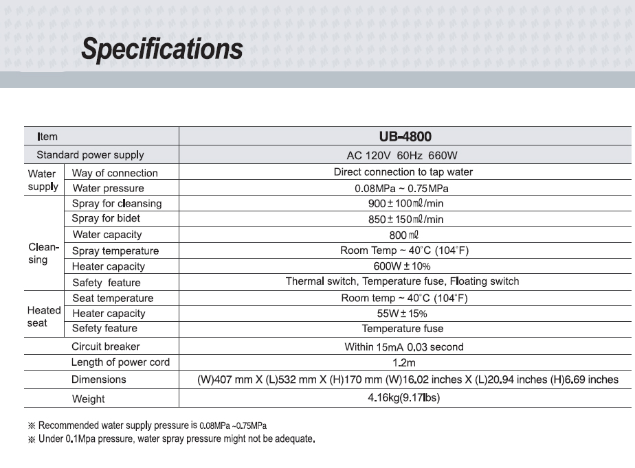 - Full Specifications- Unit Dimensions ### Included in the Box- USPA 4800 Bidet Seat- Wireless Remote Control- Water supply hose- Mounting hardware- User manual