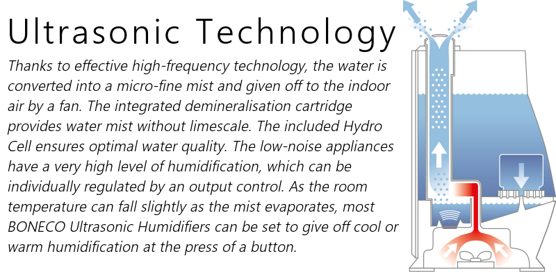 - Mains voltage - 120 V / 60 Hz- Power consumption - 45 W (140 W*)- Humidity output - 3.5 gallons / 24 hrs*- For rooms up to - 860 sq ft / 60 m2- Water capacity - 2 gallons- Dimensions (LxWxH) - 9.8 x 11.0 x 17.3 in- Weight (empty) - 8.8 lbs / 4.0 kg- Operation noise level - < 25 dB (A)- Distilled Water Recommended### Included In The Box - 1x Boneco Warm or Cool Mist Ultrasonic Humidifier