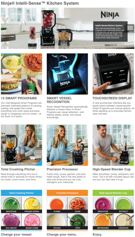 Ninja Intelli-Sense Kitchen System features one smart base that transforms into three high-performance appliances while 12 chef-designed Smart Programs effortlessly create an endless array of delicious recipes. With Ninjas Smart Vessel Recognition, program selection is easier than ever, so any time spent in the kitchen is as easy as Snap. Touch. Go.