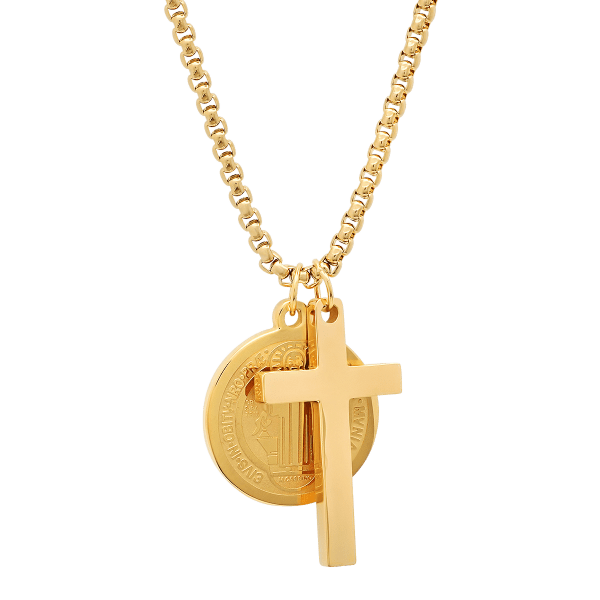 Steeltime Stainless Steel Religious Cross & St. Benedict Pendant Necklace